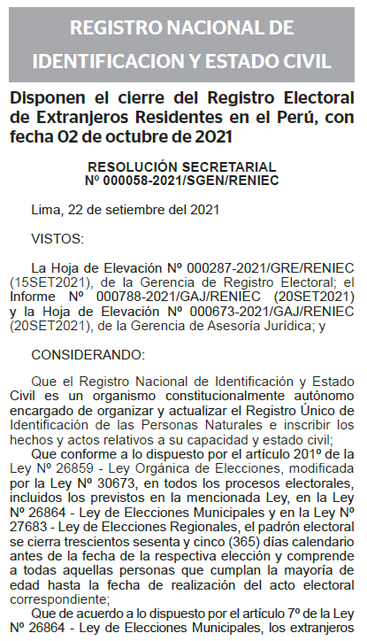 Con miras a las elecciones regionales y municipales 2022, el Registro Nacional de Identificación y Estado Civil (Reniec) ordenó que se cerrará el registro electoral de extranjeros residentes en el Perú este 2 de octubre, según se estableció en la Resolución Secretarial Nº 000058-2021/SGEN/RENIEC publicada hoy en el Boletín de Normas Legales del diario Oficial El Peruano.